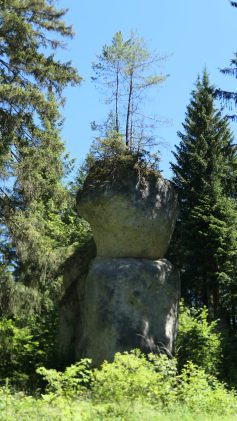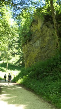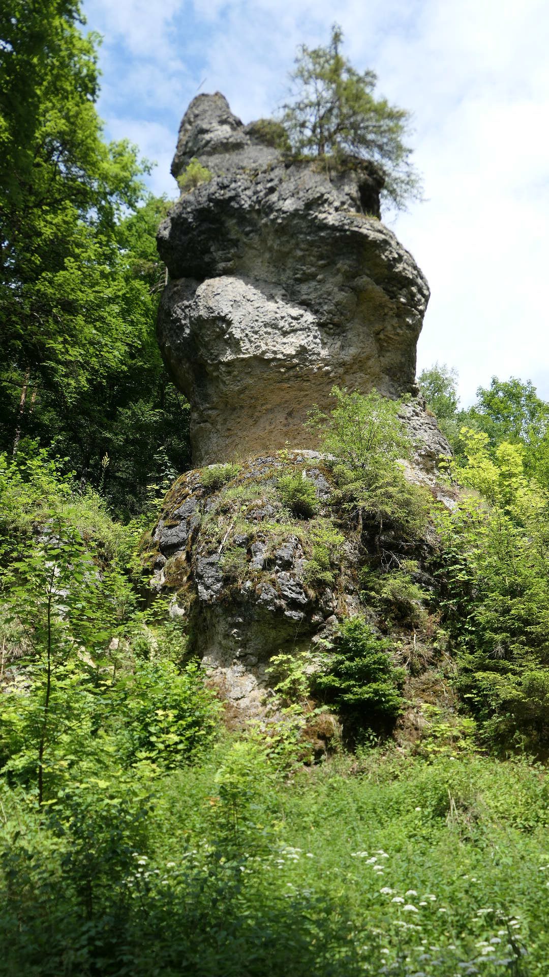 Wie von Künstlerhand geformte, aus der unbewaldeten Ebene hochgewachsene Dolomitkalke aus dem weißen Jurameer entstanden. Zufällig streifen wir einen „Gottesdienst im Grünen“. Ein Albschäfer ist auch unterwegs, seine frisch geschorenen Schützlinge suchen bei der Hitze den Schatten. Nach Überqueren der Straße bei der Gaststätte kommen wir ins Wental. Das Tal ist eng und bewaldet. Doch auch hier stehen Felsen, zum Beispiel der Spitzbubenstadel. Nach jeder Talbiegung eröffnet sich ein neuer interessanter Blick. Eine Sitzgruppe, teils im Schatten oder in der Sonne, je nach Bedarf, bietet sich zur Mittagspause an. Uns plagt der Hunger und Durst; so nehmen wir die Gelegenheit dankend an. Bald erreichen wir das Wentalweible das Wahrzeichen dieses Tals.