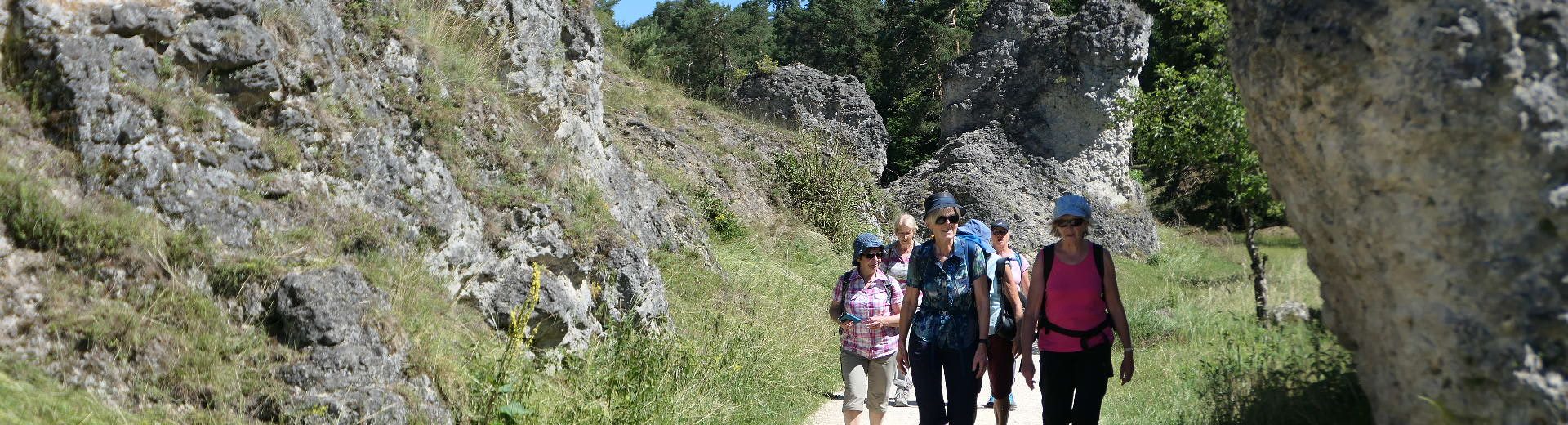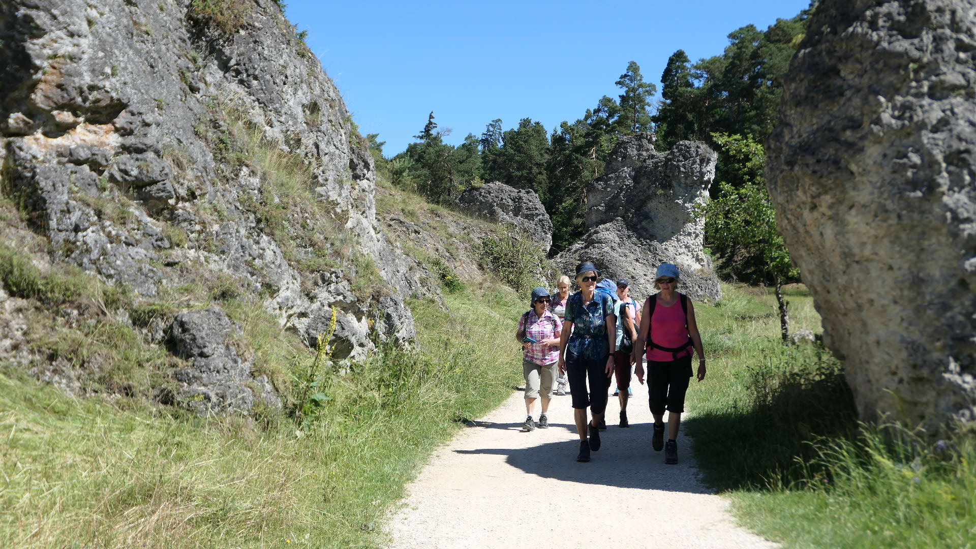 Doch in der Frühe des Morgens erträglichen Wärme. Dieses Tal soll uns zur Hälfte der Wanderung begleiten. Unsere erste Station, die Hexenloch-Doline. Der Wanderführer erzählt von der Entstehung, dieses geologisch, erdgeschichtlichen Ereignisses. Von der Verkarstung der Schwäbischen Alb, Entstehung von Trockentälern und unterirdischen Flussläufen. Wir vergessen uns selbst, als unsere Gruppe das Felsenmeer erreicht.