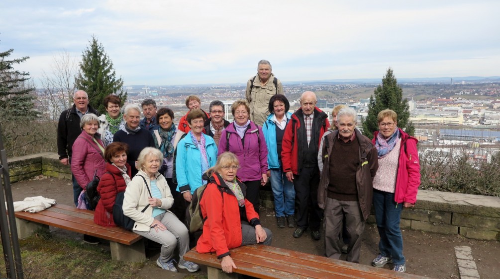 Nach voran gegangen trüben Tagen. Erlebten wir einen sonnigen Sonntagmorgen. Mit einer noch angenehmen Temperatur. So treffen sich 24 Wanderer zur Fahrt in die Landeshauptstadt. Die S-, U- und Zahnradbahn (Zacke) bringt uns zum Ausgangspunkt der Wanderung dem Haigst. Vom dortigen „Santiago – de – Chile –Platz“ ein schöner Blick auf die Stadt.