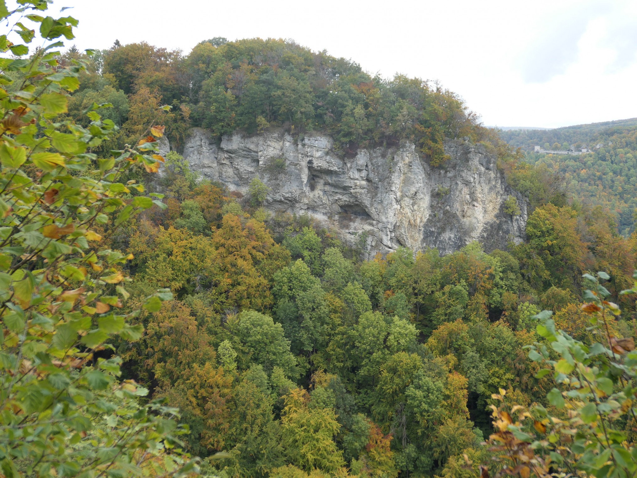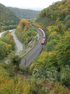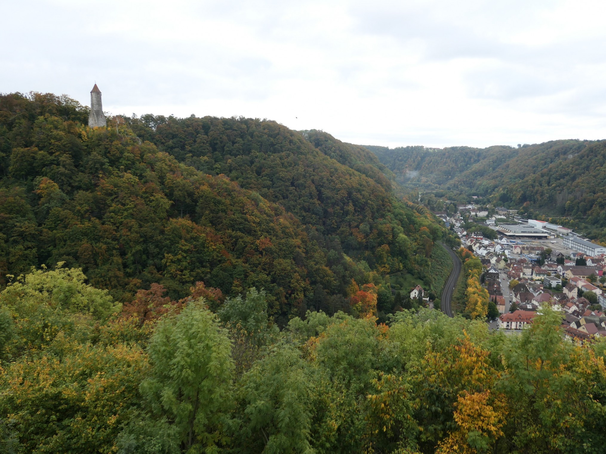 Nach Nordwesten, weitet sich das untere Filstal aus. Auf dem Weg zum Ödenturm, gleiten die Gedanken in das zurück liegende Jahr, mit den wenigen aber schönen Wanderungen, bei meist großer Hitze.Diese Tage sind nun vorbei, man braucht nicht mehr zu schwitzen, der Herbst steht vor der Tür. Unsere kleine Gruppe schreitet durch ein Farbenmeer. Von der Aussichtsplattform, vor dem Ödenturm, geht der Blick senkrecht, über die Dächer von Geislingen. Am Galgenbergfelsen geht der Blick, sowohl auf die Straße, als auch auf die Schiene, deren Kombination ein graphisches Bild erzeugt. Auf wunderbaren, urigen, weichen Waldwegen, schreiten wir Freunde der Natur durch den Wald. Ab und zu stehen abgestorbene Bäume am Wegesrand, in denen Insekten und Vögel eine Heimat finden. Nach leichtem Auf und Ab, ein letzter Ausblick am Mühltalfelsen auf die Bahnstrecke der Geislinger Steige auf dieser Talseite.