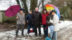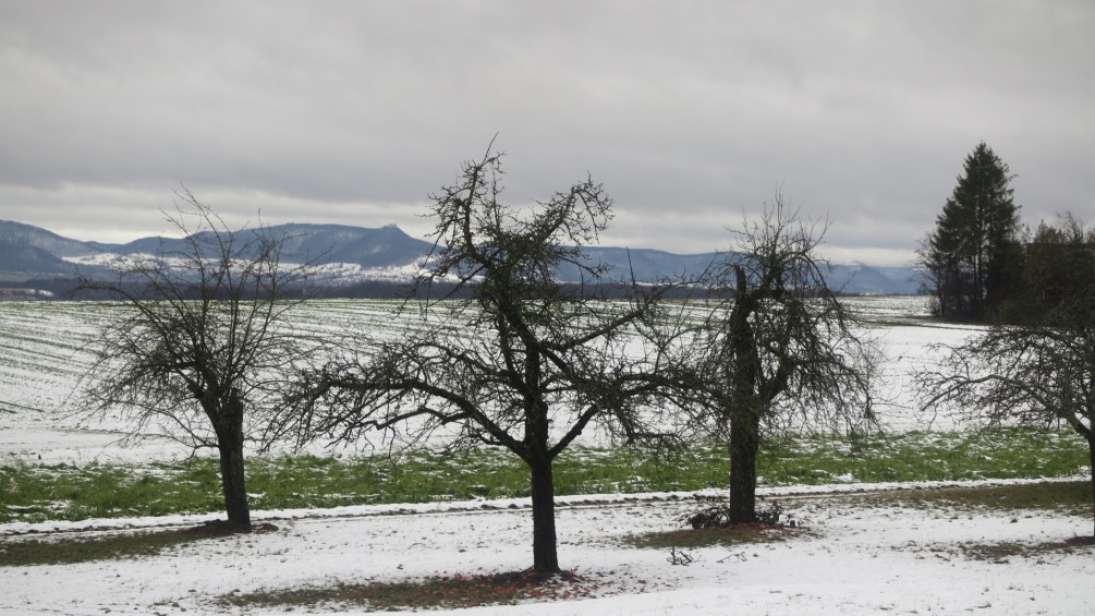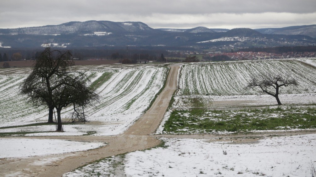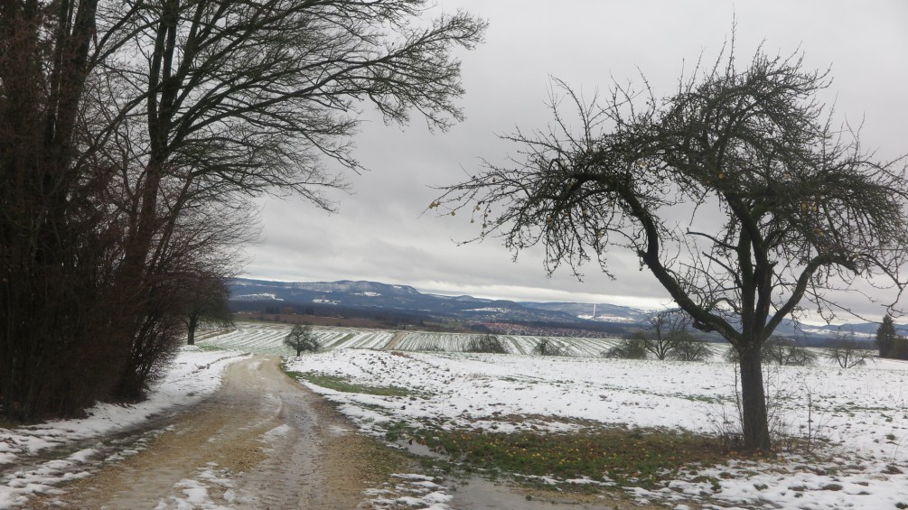 Acht Wander- und Naturfreunde, treffen sich am ersten 13. Im Neuen Jahr, um sich im strömenden Regen, ein gutes gesundes Neues Jahr zu wünschen. Am Ausgangsort Wangen gibt es die ersten Tröpfchen im Gläschen gegen „Unwohl“ sein. Bei kaum denkbar, ungünstigen Wetterverhältnissen, geht der Weg, auf einem von Zäunen eingegrenzten Pfad, ins Blaubachtal nach Unterwälden. Der Bach sprudelt, vollgefüllt, munter, Talwärts. Auf den naturbelassenen Wegen, bilden sich Seen, vom nicht abfließenden Regenwasser. Ein heiteres Schauspiel, wie mitten aus den Feldern, starke Quellen aus dem Boden entspringen und die Wirtschaftswege überfluten. Am Horizont, Wolken und Dunst von der hohen Luftfeuchtigkeit. Von Westen weht ein starker Sturm, und fegt die Sicht zur Schwäbischen Alb sauber.