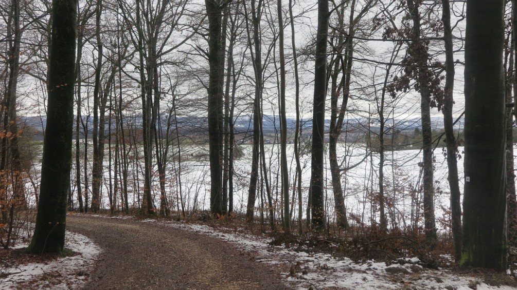 Ein unvergessener Blick, in schwarz-weiß, gestochen scharf, lässt den Albtrauf zu uns näher rücken. Allein dieses Erlebnis, hatte das Ertragen des schlechten Wetters gerechtfertigt. Am Haubuckel kommen wir auf die Höhe. Im Wald ist noch eine geschlossene Schneedecke. Neue Gefühle, neue Geräusche. Das Rauschen der Wälder. Die Schuhe knirschen im Schnee und Spuren im strahlenden Weiß. Die kräuselnden Wellen auf dem Oberwälder Feuersee. Neu auf kommender Sturm. Regenschirm im Wind, ein Problem. Gasthaus Waldhorn ein Genuss, eine Freude, hier ist endlich gut sein.