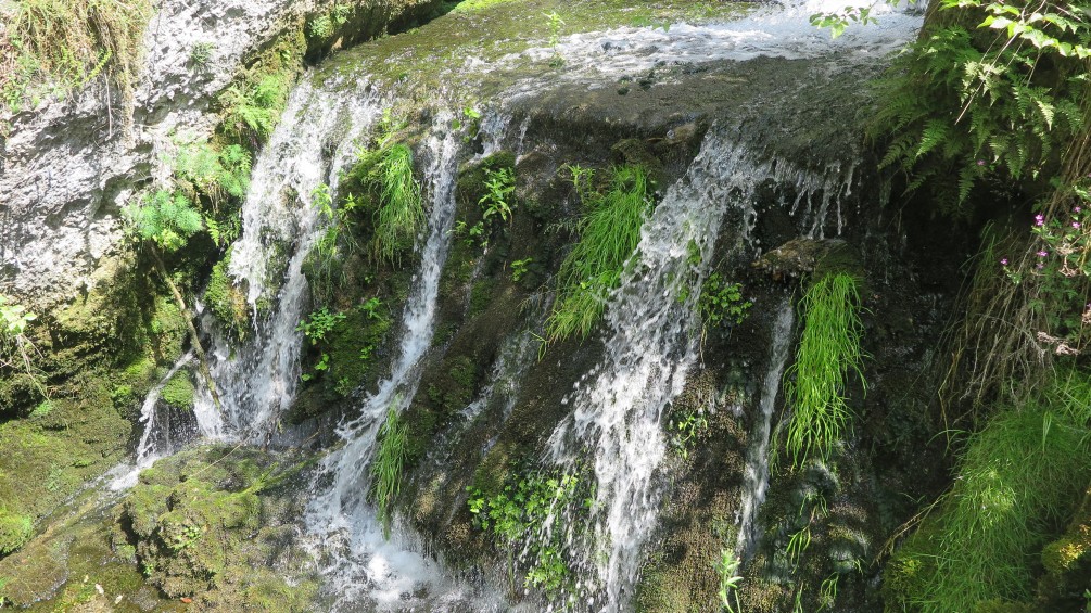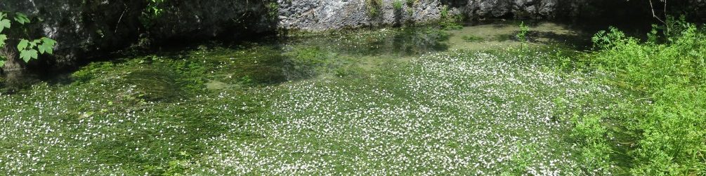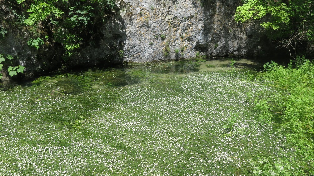 zur Belohnung gibt es einen schönen Blick über das Lautertal. Abermals geht der Weg weiter, auch mal durch Brennnesseln und sumpfigem Gelände. Aus dem Tal klingen die Glocken der „Unseren Lieben Frau“ geweihten Kirche herauf. Auf einsamen Pfad führt der Weg ins Tal, zum Lauter Quelltopf. Stark und Klar, sprudelt das Wasser aus dem Fels und bildet einen See auf dem der „fliesende Hahnenfuß“ blüht.