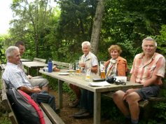 Ein Ort der Gemütlichkeit, endlich etwas vernünftiges zu trinken. Zum Beispiel ein kühles Weizenbier, wie es durch den verschwitzten Körper die Gurgel hinunter läuft. Da kann man nur sagen, ein Genuss. Dazu die mitgebrachten Leckereien. An der frischen Luft schmeckt es am besten. Die Karawane zieht weiter. Vor uns liegt der Blausteinblick, die letzte Aussicht auf das Lauter- und Blautal. Auf dem Weg zum Bahnhof, ein kurzer Besuch am Grab von Erwin Rommel. Danach beginnt das Abenteuer Bahn. Die Hohenzollernbahn bringt uns zügig nach Ulm. Auf abenteuerliche Weise erreichen wir Göppingen. Im Gasthaus Kreta auf der Ebene in Rechberghausen erlebt unsere kleine Gruppe bei Speise und Trank einen würdigen Abschluss.