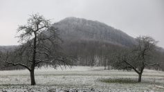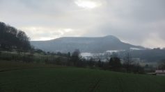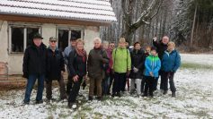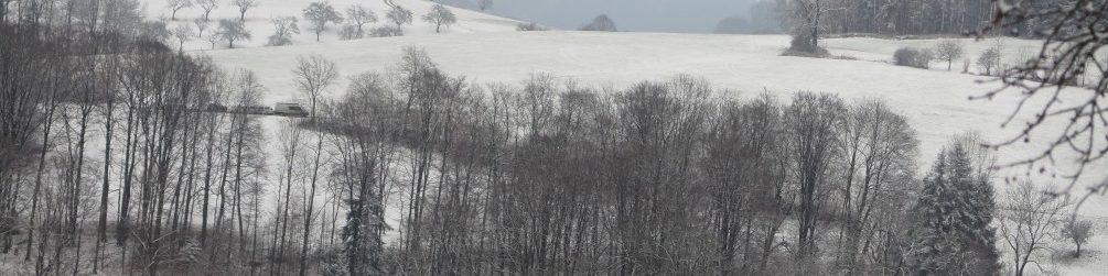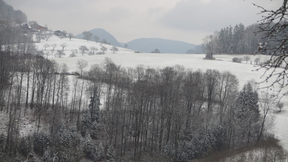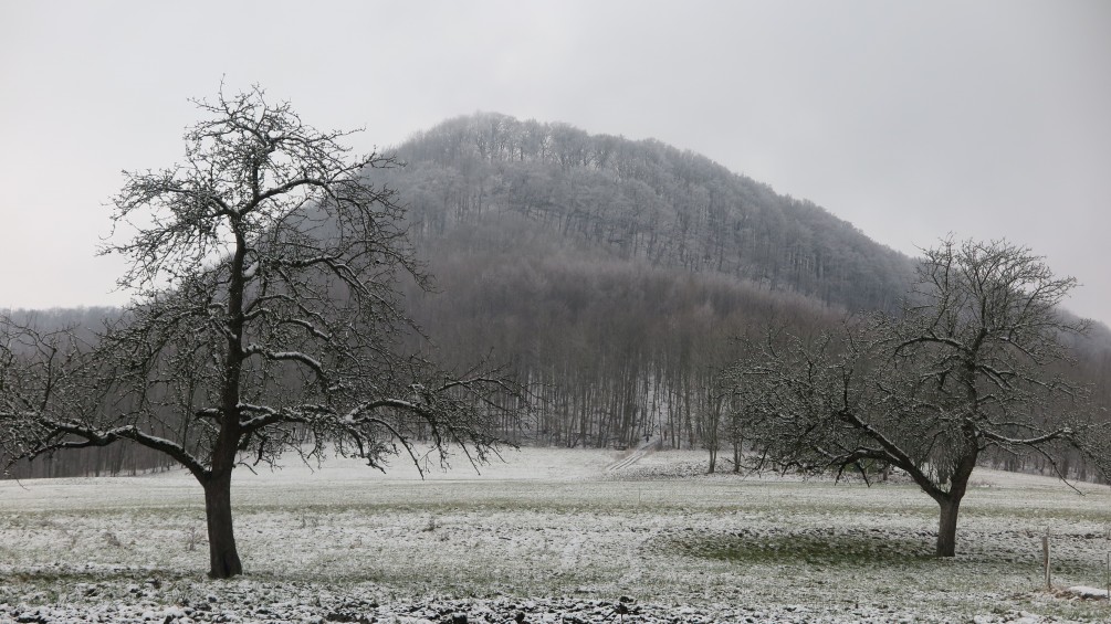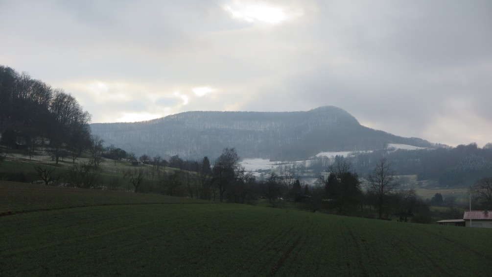 16 Wanderer treffen sich zur ersten Wanderung in diesem Neuen Jahr. Der Wanderführer begrüßt die Teilnehmer mit August-Lämmles Gedicht „Steig nuf – de Berg, guck – naus ens Land, was miere e schöne Hoamet hant! Das wollen wir auch tun, den Berg hinauf laufen. Schlat ist der Ausgangspunkt. Nasskalt ist das Wetter, die Wolken hängen in den Bergen. In gesprächigem Schritt, geht es durch den Ort. Jeder hat einen Diskussionsbetrag auf Lager, Jüngster der Gruppe ist 10 Jahre alt und hat den schönen Namen Fritz. Nach Verlassen der Straße nach Eschenbach, wandern wir zwischen dem Wald des Kuhnbergs und dem Streuobstwiesengürtel aufwärts.