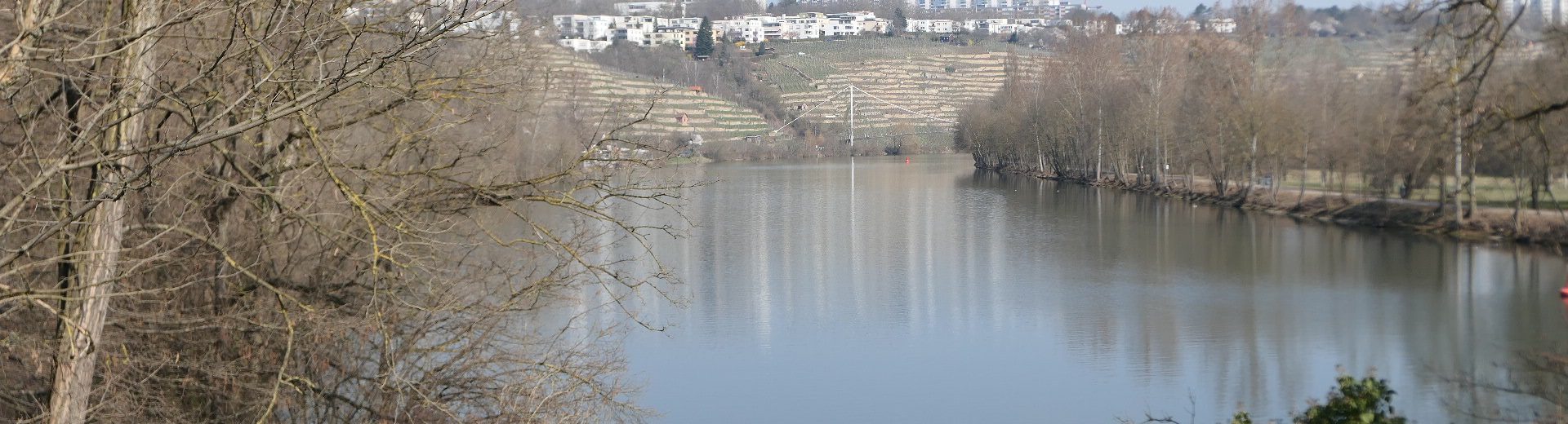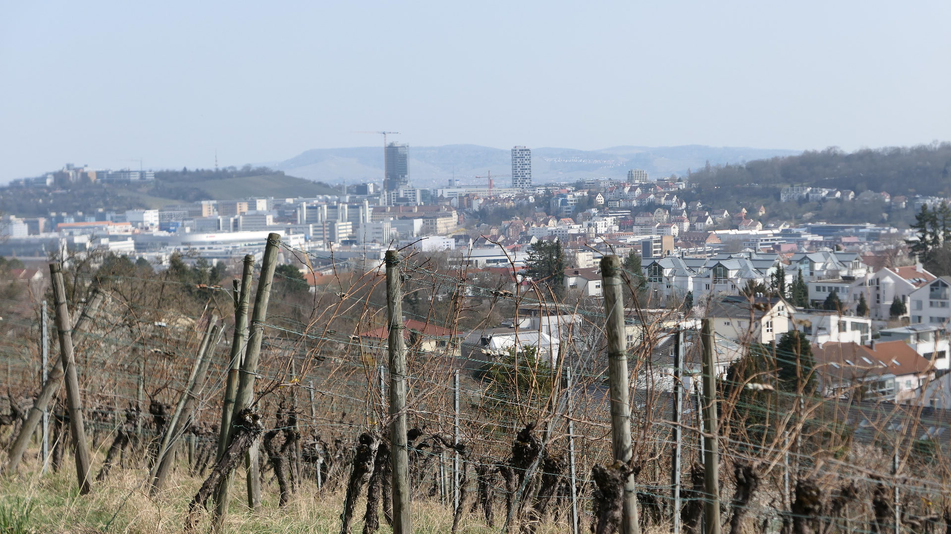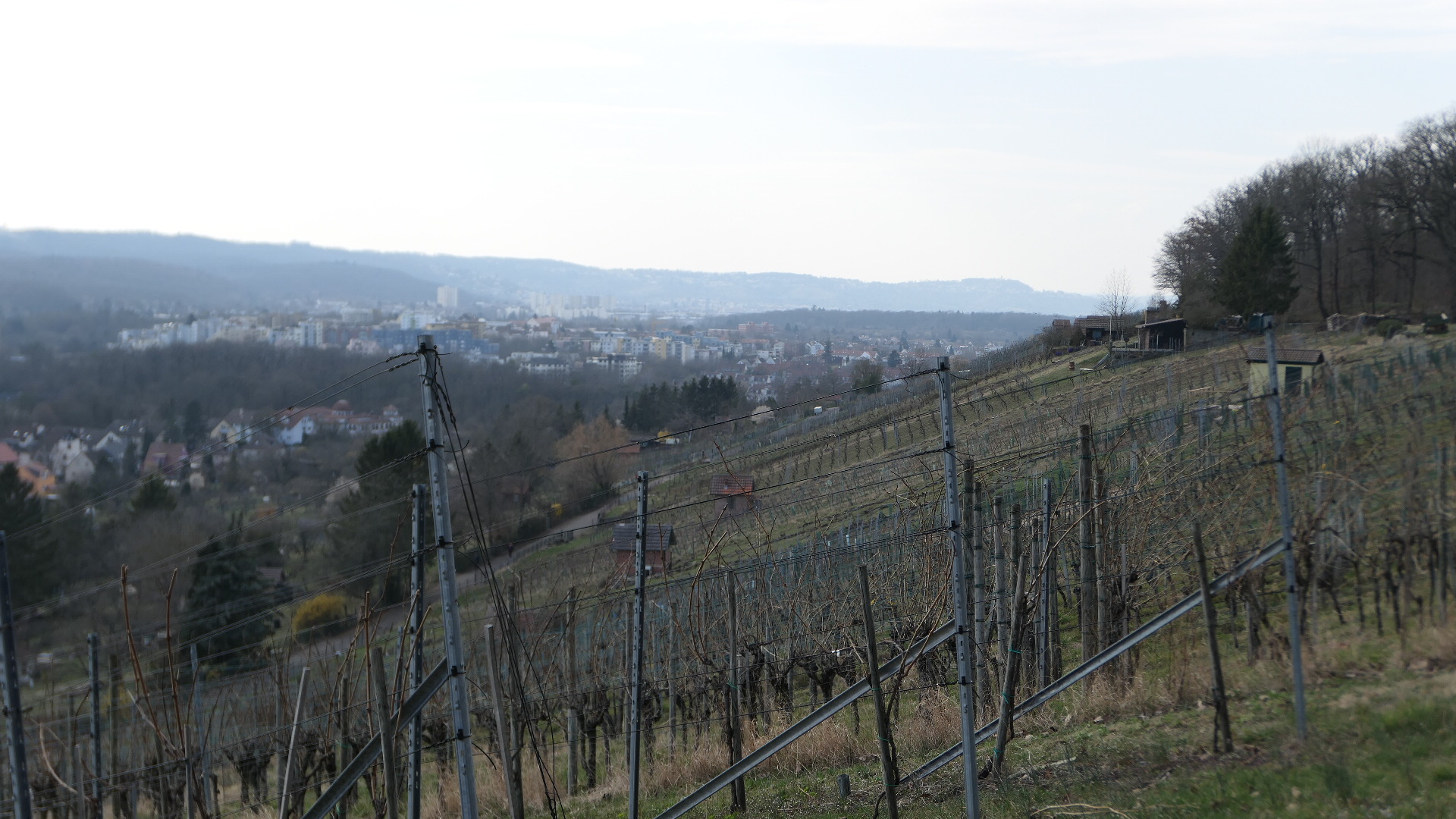 Mit öffentlichen Verkehrsmitteln, das heißt Bus, Zug und U-Bahn erreichen wir zügig die Station Wagrainäcker bei der Aubrücke: über Treppen, am Rand eines Weinbergs, mit imposantem Tiefblick auf den Neckar und deren Umgebung geht es aufwärts zum Schnarrenberg.