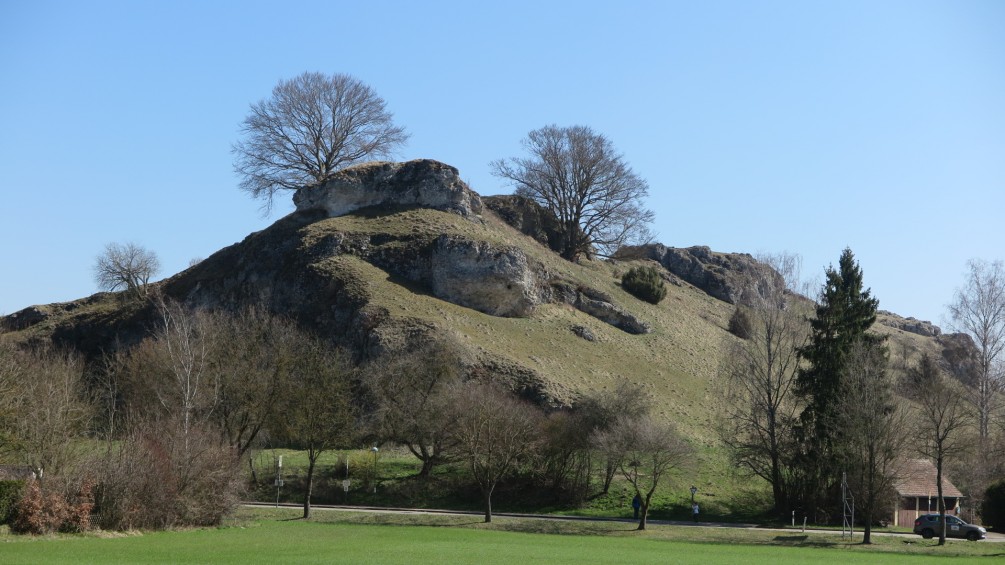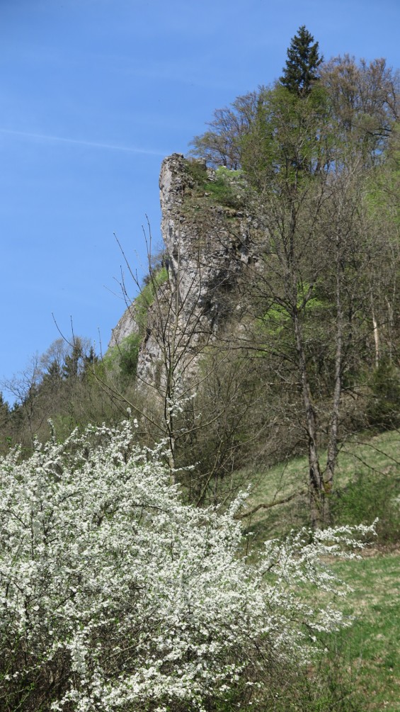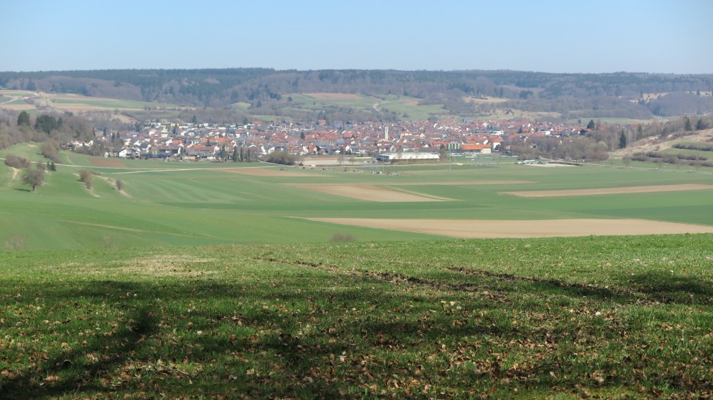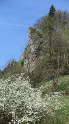 Im Vordergrund blühende Schlehenbüsche. Über dem Talgrund des Hirschtals, erreichen wir die Staumauer des Gnannentals. Dort machen wir die wohl verdiente Mittagspause. Die Sonne erreicht den Zenit, somit auch die Hitze ihren Höhepunkt. Mit viel Mühe, erreicht unsere Gruppe, über einen steilen Aufstieg die Hochfläche. Dort weht zur Belohnung, ein leichter Wind. Auch hier freie Sicht, ins Steinheimer Becken. Zwischen Feldern, führt der Weg, an einer Wiese, mit sich sauwohl fühlenden Wollschweinen vorbei. Im Städtchen angekommen, auf der Terrasse eines überfüllten Eiscafes wird erst einmal Pause gemacht. Dann Teilt sich die Gruppe. Ein Teil wandert über den Berg Steinhirt mit „Rund um Sicht“ ins tiefer liegende Krater Becken auf Sontheim.
