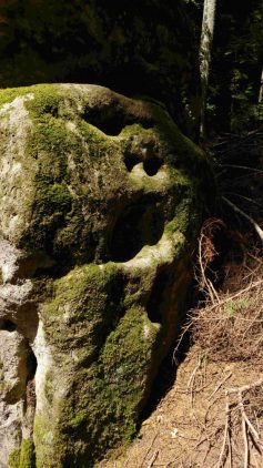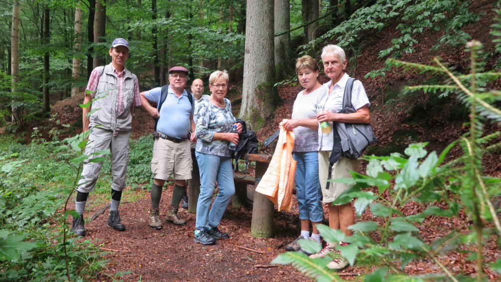 Ein leichter Wasserfall, einem Wasserstrich gleich, plätschert zu Boden. Nach wenigen Metern, machen wir einen Abstecher zum Naturdenkmal „Elefanten“. Dies ist ein einzelner, verwitterter Sandsteinbrocken in Form dieses Tieres. Auf verwunschenen Pfaden, erreichen die Wandersleut, den Grund des Mühlbachtals. Jenseits des Tales, folgen wir dem Weg in eine felsige mit Moos bewachsene Schlucht zur Schillergrotte. Ein Erdrutsch zwingt uns zur Umgehung. Schwer geht der Atem, ich schwitze unentwegt, die Tropisch hohe Luftfeuchtigkeit, versetzt meine Gedanken, in ein fernes Land. Beim Austritt aus dem Wald, konnte man wieder frei durchatmen. Abermals durchquert der Pfad , diagonal eine Klinge. An reifen Heidelbeerbüscheln vorbei, steigen wir immer höher.