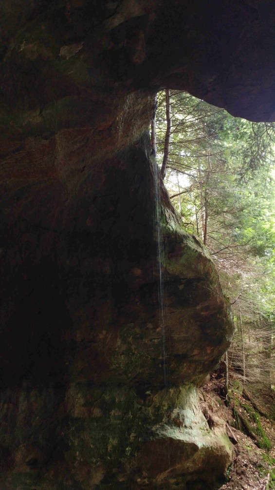 Immer wieder Sonntag’s heißt es in dem Lied. So veranstaltet auch der Albverein an diesem Tag einmal im Monat eine Wanderung. Sieben Wanderer trotzten der schlechten Wettervorhersage und gingen auf Tour. Im nahen Alfdorf, sollte es die Ronde des Hasen sein. Zwischen Wiesen und Felder schlenderte unsere Gruppe Richtung Mühlbachtal. Der Himmel ist bedeckt mit vielen rätselhaften Wolkengebilden, die eine hohe Luftfeuchtigkeit erzeugen. Der Hohenstaufen ist in Wolken gehüllt. Bald ist der Waldrand erreicht. Steil ab führt ein Pfad zum grottenähnlichen Sandsteingebilde „Hohler Stein Alfdorf“.
