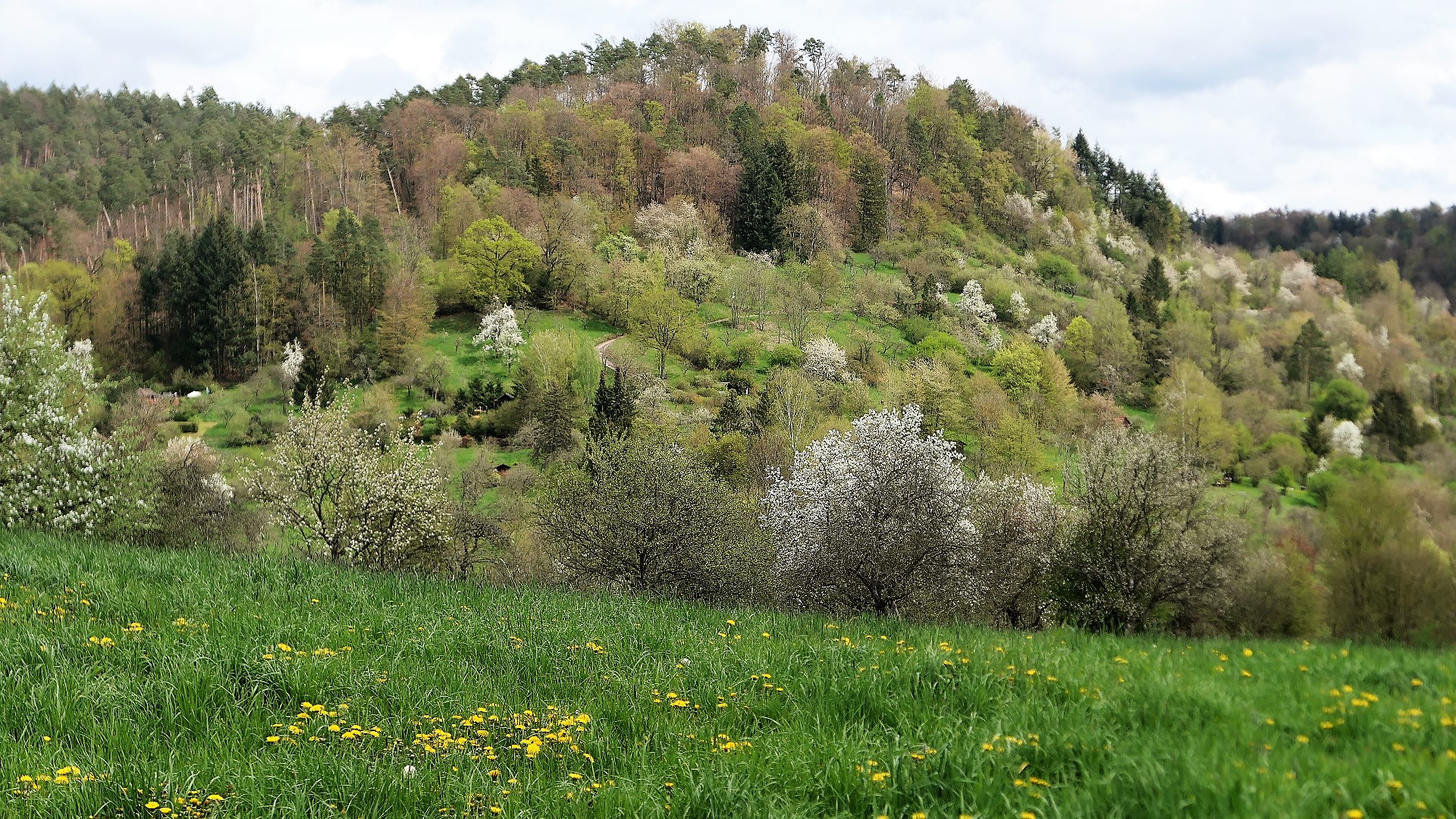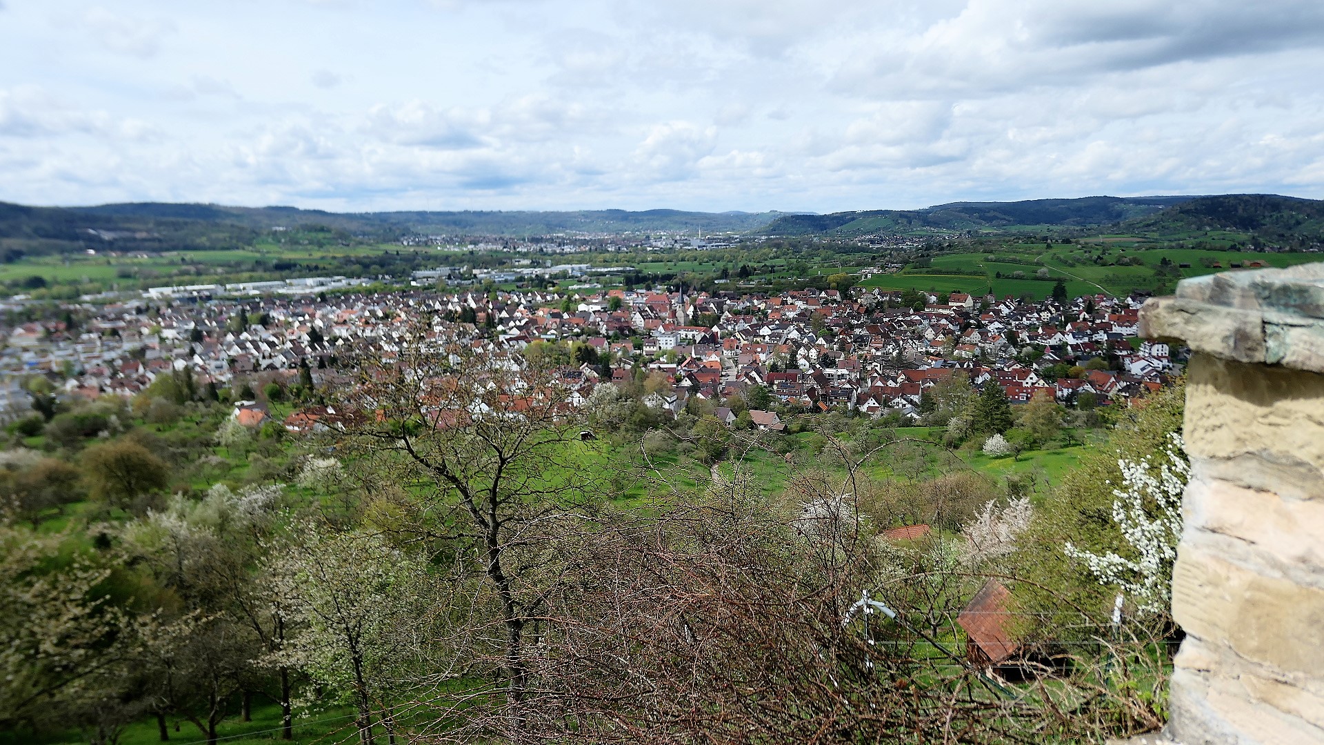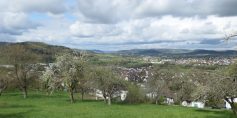 Man kann sich nicht genug sattsehen an noch blühenden oder schon grünen Bäumen. Am  Aussichtspunkt Gänsberg machen wir Pause mit Blick auf Urbach.