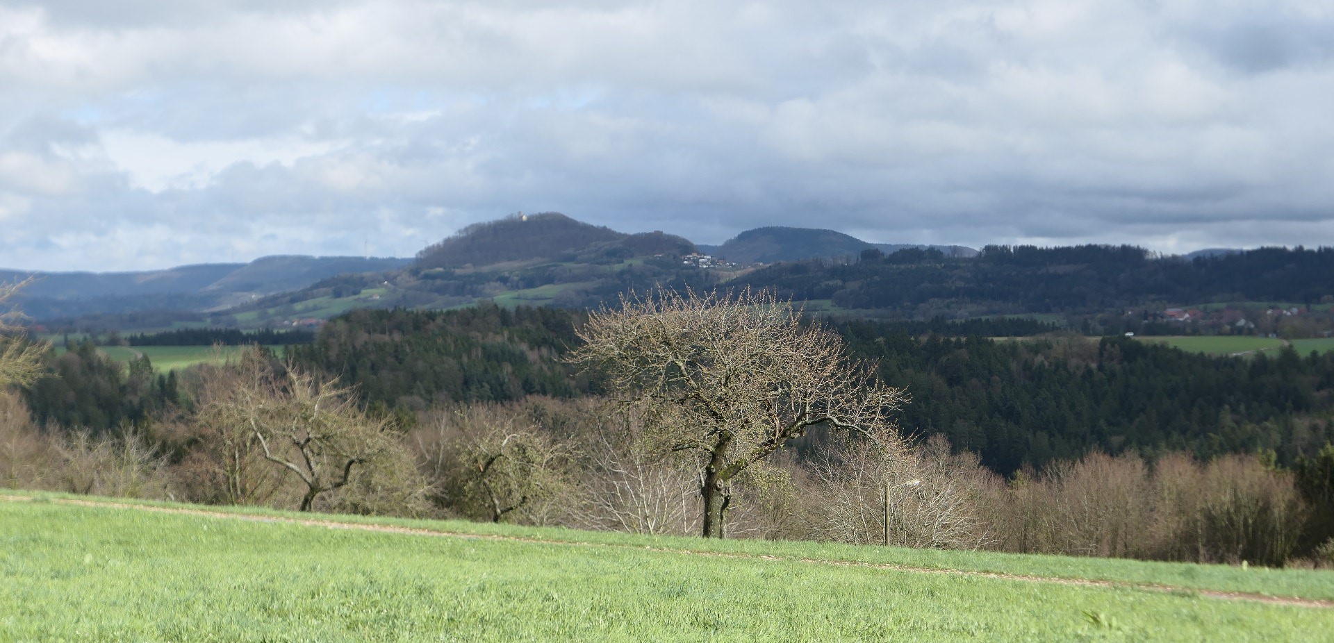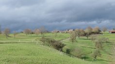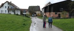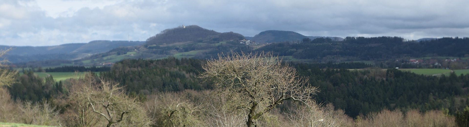 Das Vieh vom Beutenhof auf der Weide scheint sich über so was keine Gedanken zumachen; Hauptsache das Fressen schmeckt. Der Bach plätschert, am Wegesrand blühen die Buschwindröschen. Der Weg vom Tal durch den Wald ist etwas dreckig. Auf einer Lichtung der kleine Weiler Schnellhöfle. Auf der Höhe angekommen, nach dem Verlassen des Waldes. Herrlicher Blick über das Beutental und im Hintergrund die Berge Hohenstaufen und Rechberg.