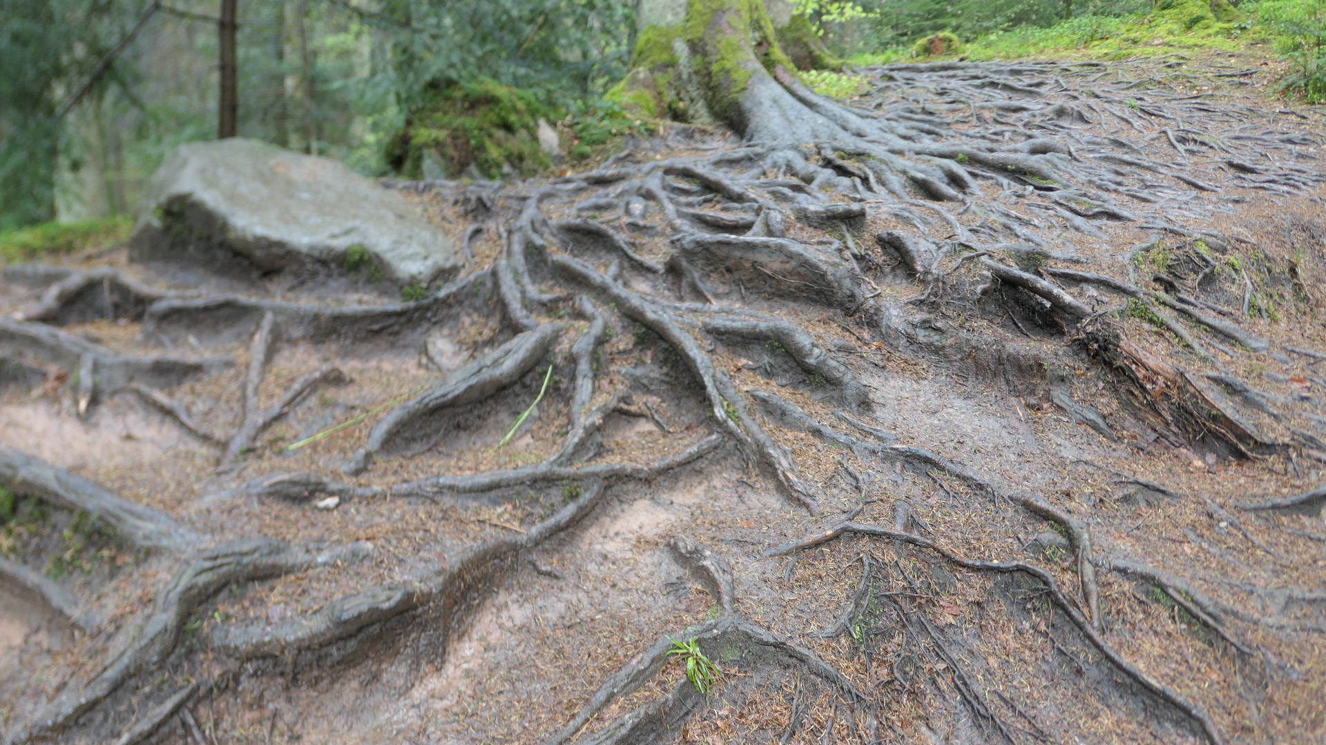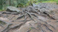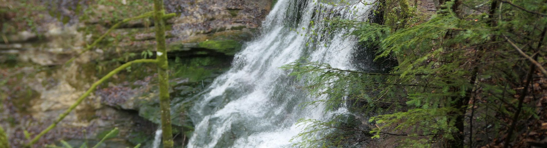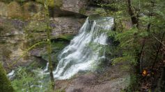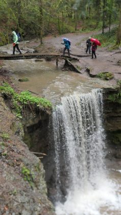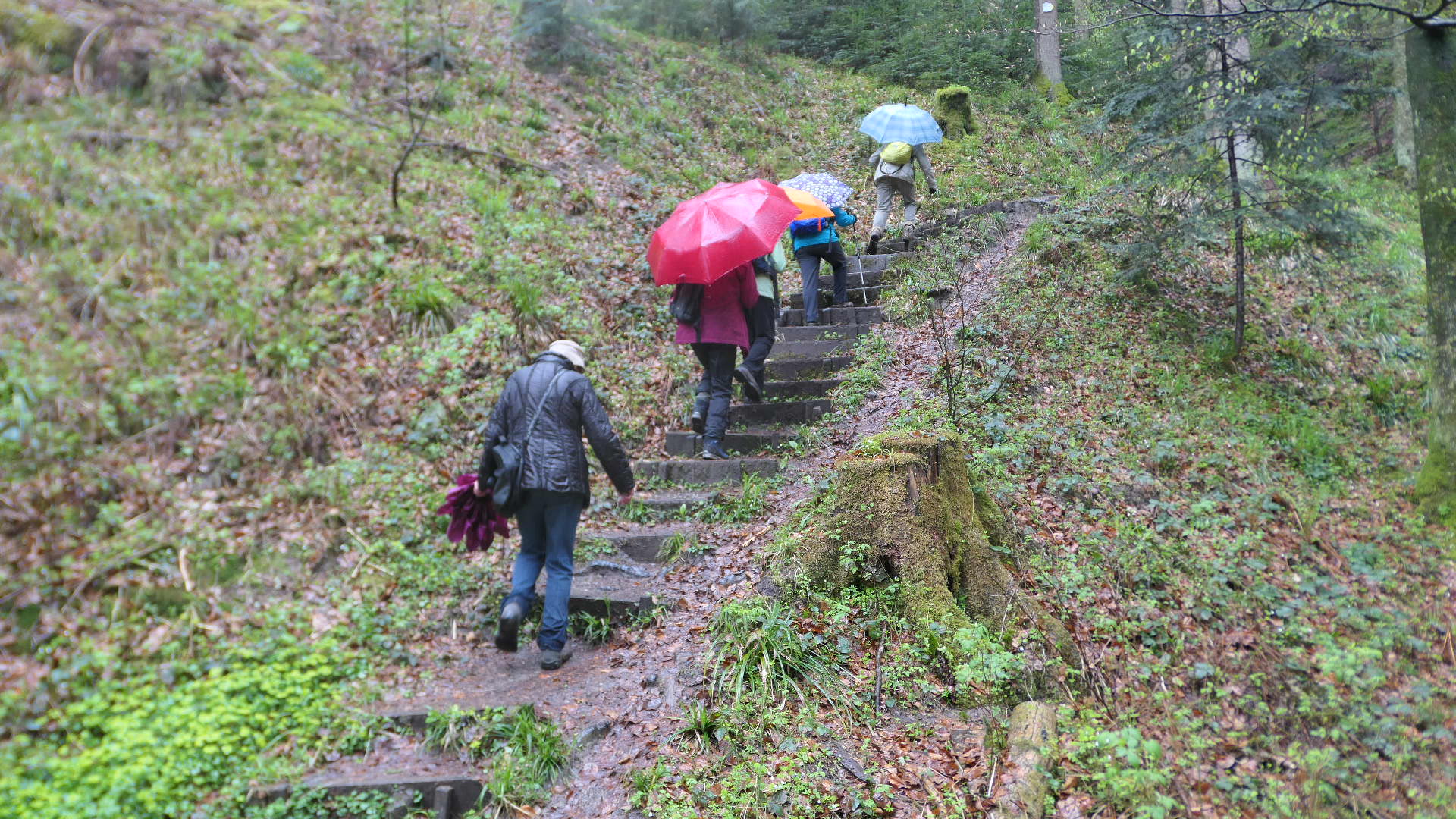Im Stehen zwischen den Bäumen essen wir unsere Brote und trinken ein Schnäpschen dazu. Über den Grenzsteinweg geht es abwärts zur Hörschbacher Sägmühle. Bald erreichen die etwas „Durchnässten“ die Oberen Wasserfälle.