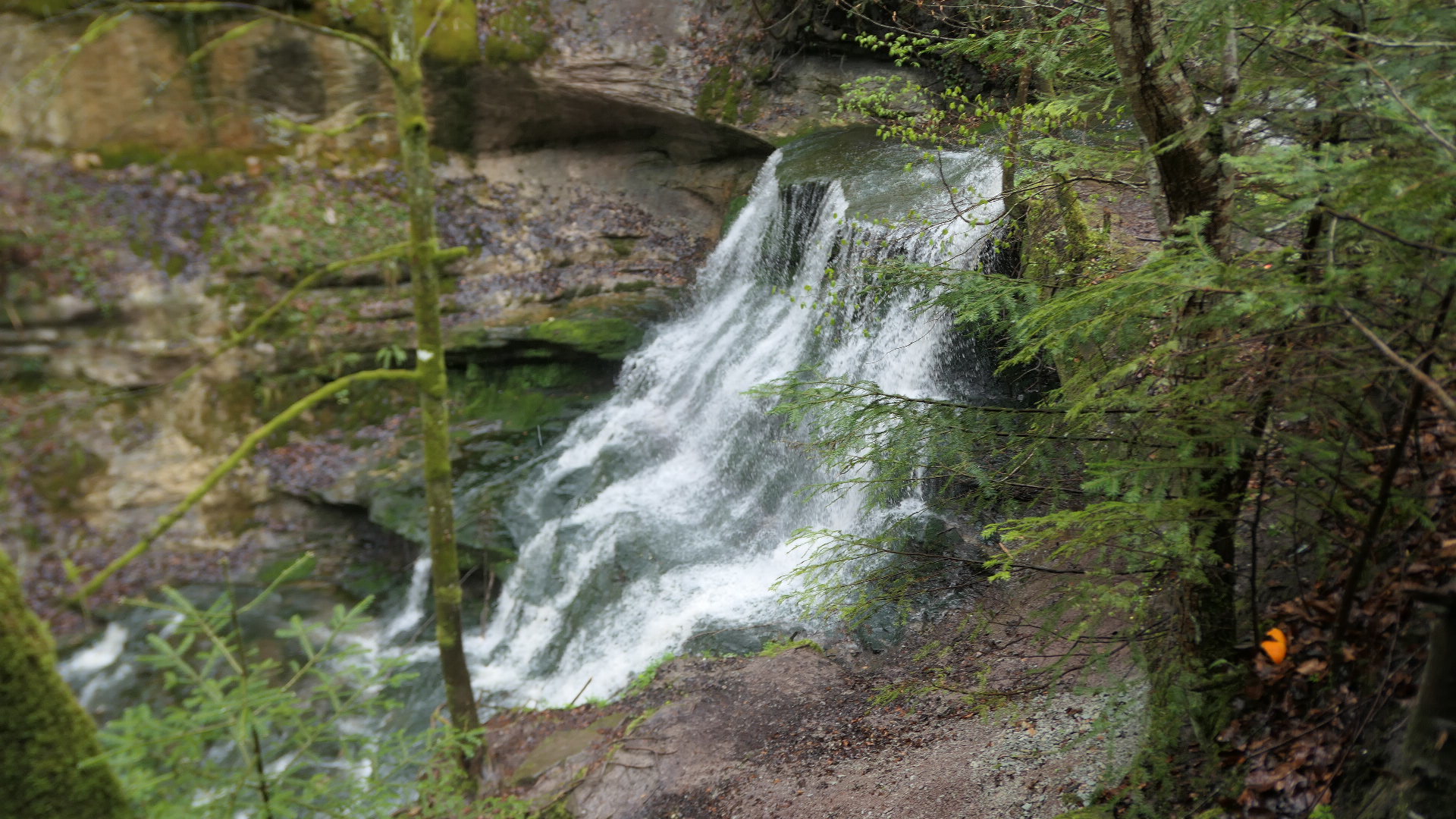 Über Baumwurzeln, Tümpeln, Steinen und Löchern stolpern wir abwärts zum Vorderen Wasserfall. Ein frei fallender, breiter Wasserfall, dahinter eine Brücke.
