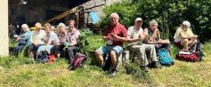 Diese Abwechslung löst auch Begeisterung aus. Man merkt unsere Wanderung führt auf überwiegend urigen unmarkierten Wegen. Im Tal fließt der mäandernde Krummbach,.so kommen wir nach Tennhöfle im Leintal. In dem kleinen Weiler machen die Hungrigen Mittagspause, verzehren ihre Vesperbrote auf der Begrenzungsmauer einer ehemaligen Miste und beobachten dabei die Bauern bei der Heuernte.