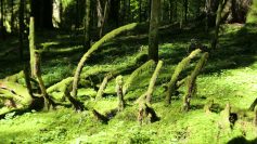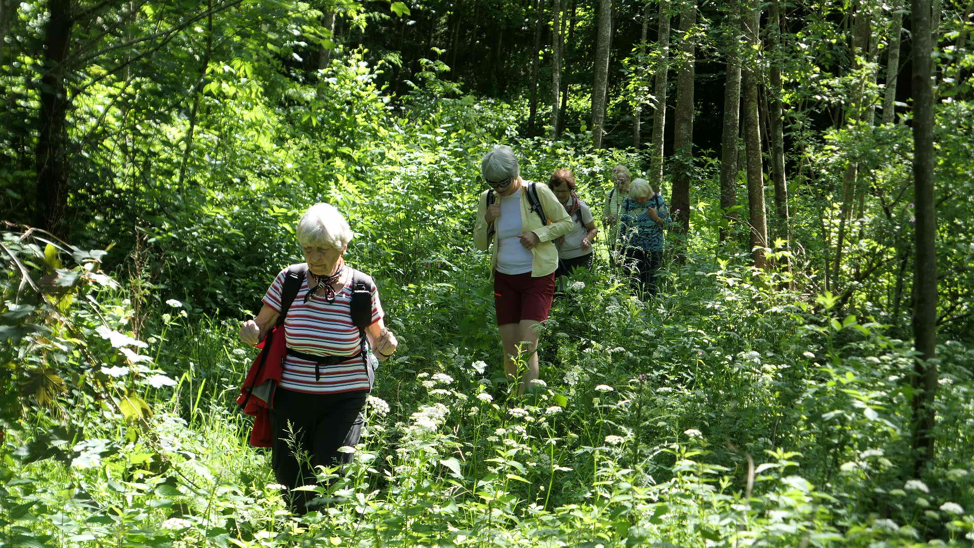 Die hohe Luftfeuchtigkeit überzieht Bäume und Totholz mit frischem leuchtendem grünem Moos. Aus dem Tal herauf auf einer Anhöhe kehren die Wanderer wieder in die gewohnte Stille zurück. Fast unbemerkt über ein Brückchen überqueren die vorwärts Strebenden das Hafental. Über ein Seitental geht es auf urigen steilem, breitem Weg durch den Wald aufwärts. Beim Verlassen des Waldes sieht die  Gruppe die Häuser von Vordersteinenberg, über dem Reichenbachtal die Kirchtürme von Spraitbach und südlich die Schwäbische Alb. Durch eine Klinge mit hohem Gras und Brenneseln gelangen die Wandersleut ins Krummbachtal.