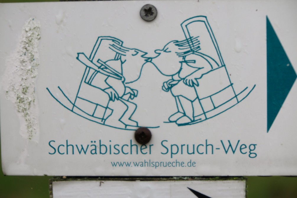 Petrus wollte uns prüfen und uns die Laune vermissen, doch das gelang ihm nicht. Wieder kam es nass von oben, wir retteten uns in den Geräteschuppen eines Landwirts. Käsfüß und Schnaps war der Pausen füller. Weiter ging die Wanderung der Witterung angepasst. Über jeden Spruch am Wegesrand amüsierten wir uns köstlich. Kurz vor Gammelshausen auf dem Obstlehrpfad, riss die Wolkendecke auf und die Sonne strahlte flach ins Land. Innerhalb kurzer Zeit wurde die Gegend in eine Märchenlandschaft verwandelt. Die Blätter glitzerten wie lackiert,