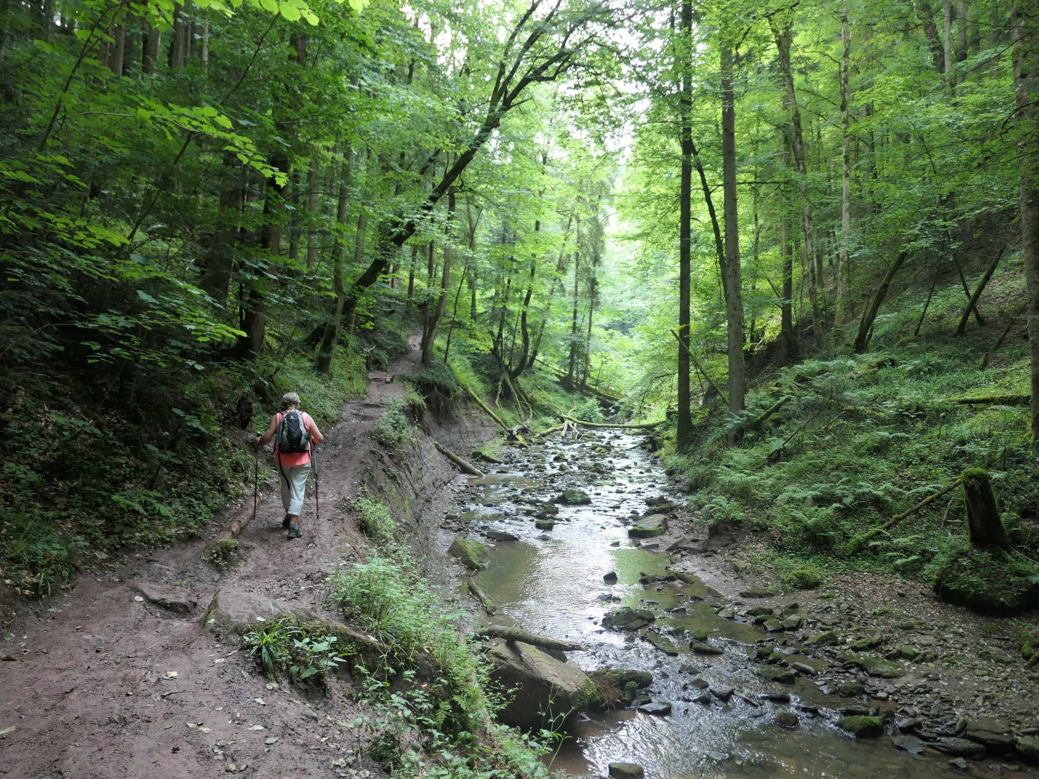 Ein auf und ab und hin und her bringt uns auf herrlichen Wegen in den Grund des oberen Wieslauftals. Auf der anderen Seite geht es aufwärts zur Geldmacherklinge.