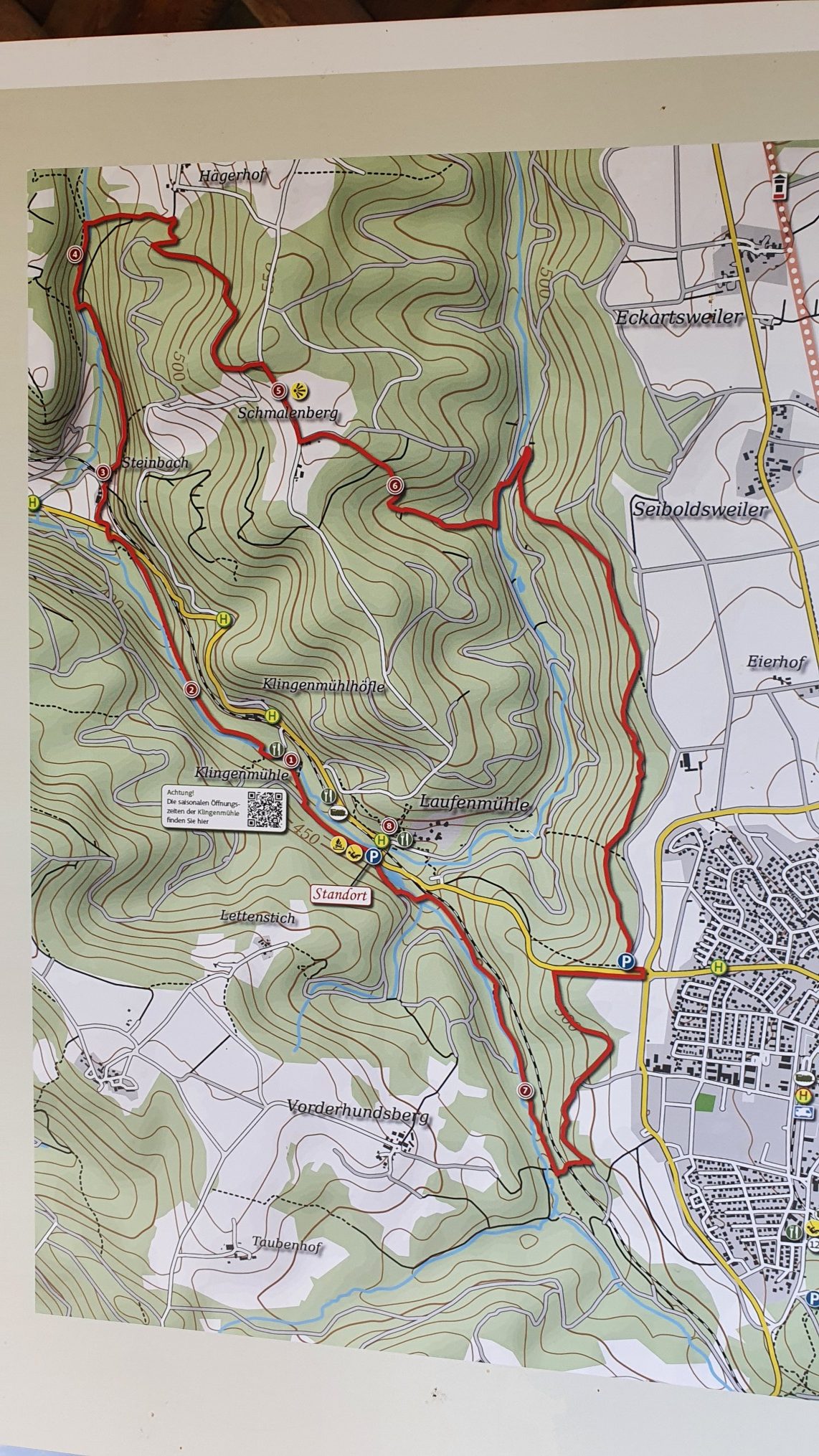 Wanderstrecke: Laufenmühle – Edenbachschlucht – Bockseiche – Oberes Wieslauftal – Geldmacherklinge – Schmalenberg – Strümpfelbachtal – Steinbach – Wieslaufschlucht – Klingenmühle – Laufenmühle