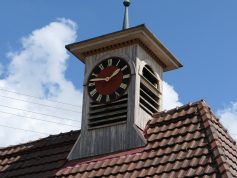 Rückwärts schauend ein schöner Blick zu unserem Ausgangspunkt, mit der Kirche. Über eine Aussichtsreiche, freiliegende Hochfläche führt die Route nach Birkenweißbuch. bekannt mit seinem Glockentürmchen mit Uhr.