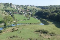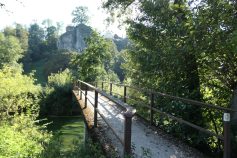 über die Brenz auf der anderen Seite des Tales. Aufwärts geht’s über den bewaldeten Berg Buigen. Von deren Hütte mit gleichem Namen haben wir einen sagenhaften Blick über das Tal, auf die Brenz, die Felsen und das Dorf Eselburg. Über den am Anfang des 19. Jahrhunderts angelegten Jägersteig steigen wir ab ins Tal und überqueren einen Steg der Brenz. Mit Blick auf den Felsen: die Ruine Falkenstein.