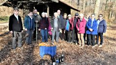15 Wanderer, ließen es sich nicht nehmen mal wieder in einer Gruppe unterwegs zu sein. Die Nacht war kalt. Dadurch erlebten wir einen strahlend blauen Himmel mit Sonnenschein und einer Temperatur von über 10 Grad. So ist es nicht verwunderlich: ein Lächeln machte die Runde. Von Wangen, über freies Land, der langen Äcker, kommt die Gruppe zum Schurwald. Hinter uns die Schwäbische Alb, vom Gegenlicht der Sonne, noch etwas im Dunst. Leicht steigt der Weg an zum Wangener Gemeindehaubuckel. Nach Westen, im flotten Schritt, führt der Weg zur Gemarkung Brenzenhau. 1999 legte der Orkan Lothar den Schurwald flach. Nur die robustesten Bäume überlebten, die sind heute Riesen. Ehrfürchtig, versuchen wir die Baumspitze zu erblicken. Was hat der Baum, durch den Gang der Zeiten schon alles erlebt. Tief in uns allen liegt das Gefühl für Bäume. Vor allem wenn sie „Mächtig“ sind. Weltachse zwischen Himmel und Erde. Erscheinungsbild in vielen Kulturen. Erscheinungsort für Götter und Geister. Immergrüne Bäume, Symbol für Unsterblichkeit. Laubbäume Symbol für ständige Erneuerung und Auferstehung. Mit kaum merkbarem Aufstieg erreichen wir den Lemberg mit seiner Blockhütte.