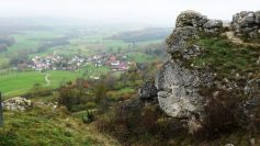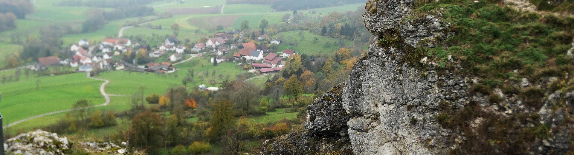 – Löwenpfad – Spielburg – Runde – Die letzte Mittwochswanderung in diesem Jahr. Sieben Wanderer treffen sich um aus der gewohnten Enge ihrer Wohnung zu entfliehen. Gierig nach Bewegung an der frischen Luft. Bei angenehmer Kälte beginnen wir unsere kleine Wanderung bei der Albvereinshütte in Hohenstaufen. In den Bäumen heben sich die letzten Blätter in wunderbaren herbstlichen Farben vom Dunst des Himmels ab. Bald erreichen wir das Naturschutzgebiet Spielburg. In der Tiefe des Tales, von einer Nebelschicht überzogen der kleine Weiler Hohrein.