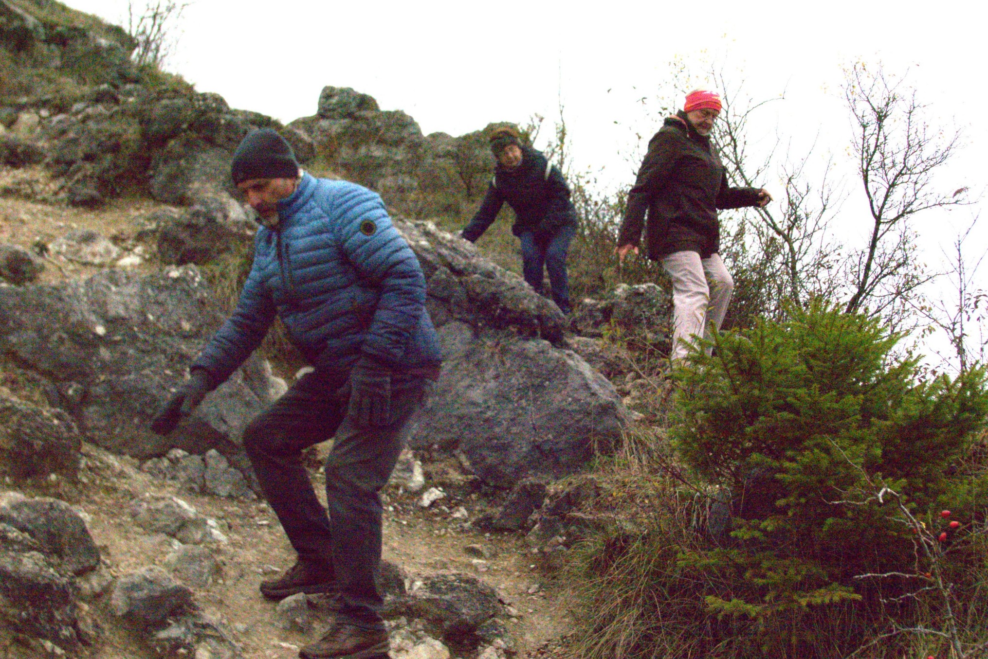 Für manchen etwas ungewohnt der Abstieg vom Felsen der Spielburg auf den Weg zum Dorf.