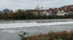 Über eine Brücke überqueren wir den Fluss Steinach und kommen am Heimatmuseum vorbei wieder an den Neckar. Beim Ruderclub Nürtingen ist trotz des schlechten Wetters viel Betrieb. Nun geht es am Fluss entlang immer mit Blick auf das Wasser. Es wurde ein Kanal angelegt, so entstand eine Insel. Plötzlich sind wir am Wehr von Neckarhausen.