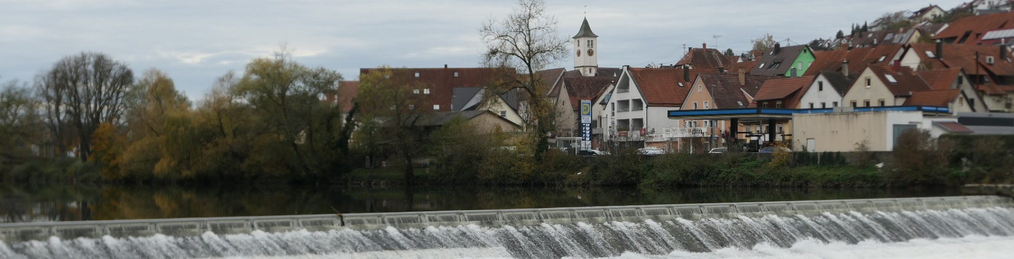 Über eine Brücke überqueren wir den Fluss Steinach und kommen am Heimatmuseum vorbei wieder an den Neckar. Beim Ruderclub Nürtingen ist trotz des schlechten Wetters viel Betrieb. Nun geht es am Fluss entlang immer mit Blick auf das Wasser. Es wurde ein Kanal angelegt, so entstand eine Insel. Plötzlich sind wir am Wehr von Neckarhausen.