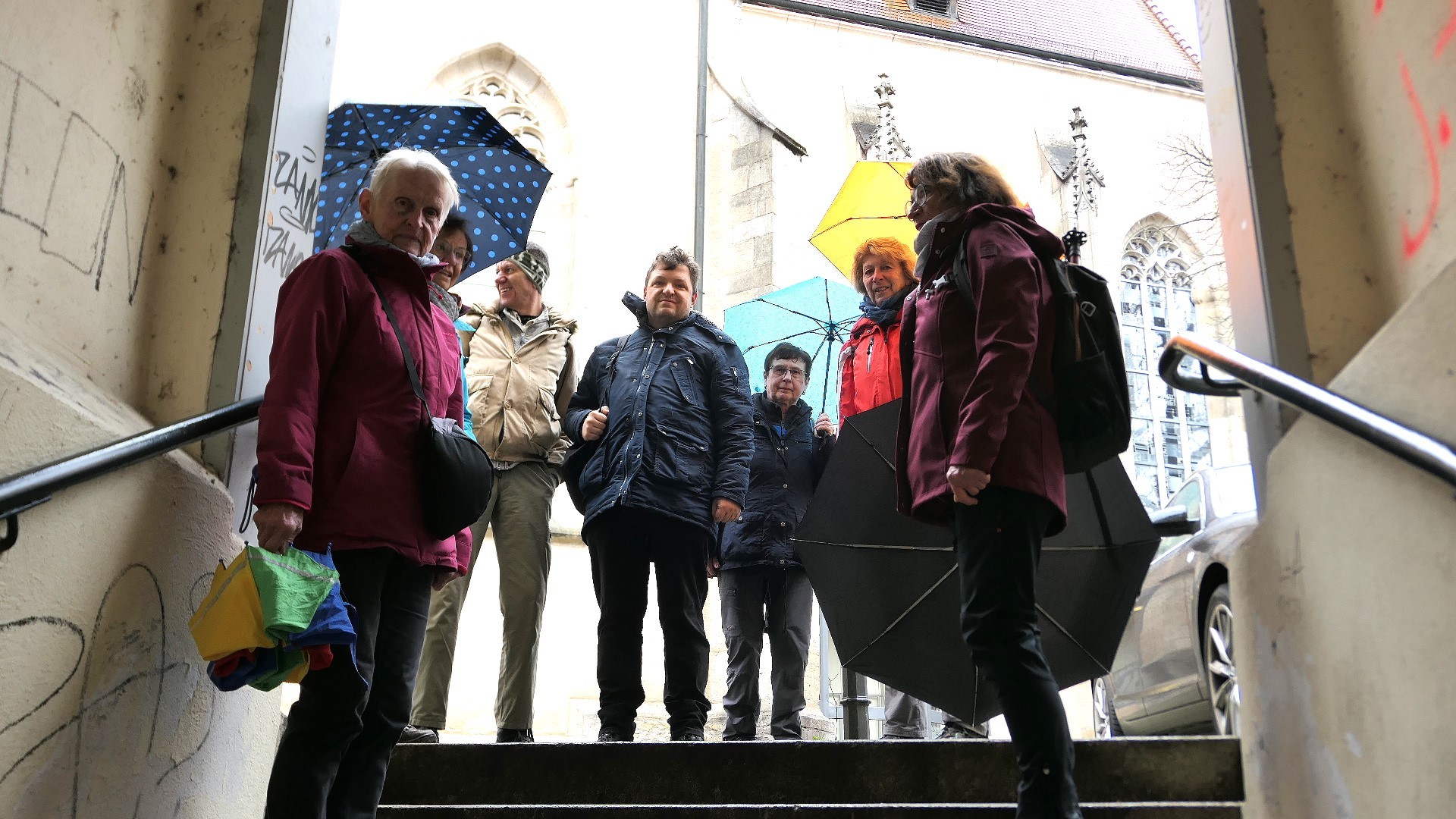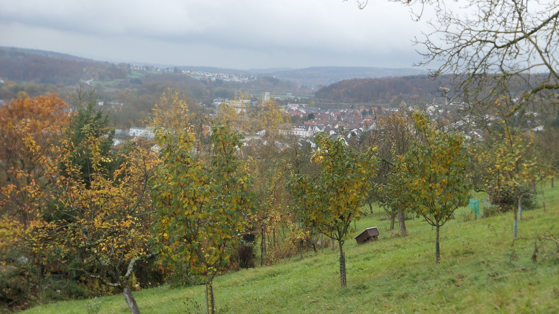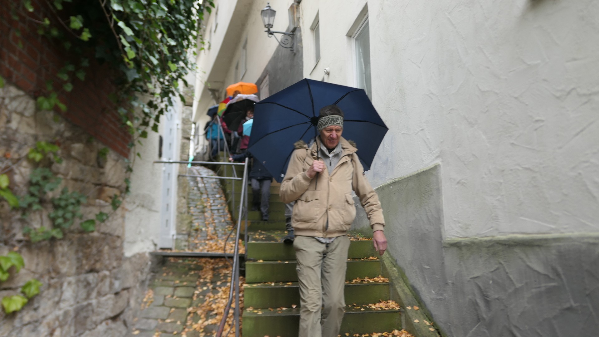 Zehn Wanderer treffen sich am Bahnhof in Rechberghausen zur Fahrt nach Nürtingen, dem Beginn unserer Wanderung. Die Witterung ist herbstlich, kühl, wolkenverhangen, ein leichter Sprühregen begleitet uns. Doch die Stimmung in unserer kleinen Gruppe ist harmonisch bis heiter und mancher ist zu einem Späßchen aufgelegt. Am Ausgangspunkt steigen wir durch enge schmale Gässchen an der „Weinstube am Schloßberg“ vorbei hoch zur Stadtkirche. Ein langes am Berg befindliches Gebäude hat es uns angetan. Denn durch dieses geht eine bogenförmiger Durchgang auf einer Treppe abwärts. Auf einer Hinweistafel erfahren wir, dieses war die Lateinschule in der auch Friedrich Hölderlin unterrichtet wurde. Auf der anderen Straßenseite zieht sich eine schmale Treppe mit dazwischen ebenen Unterbrechungen talwärts.