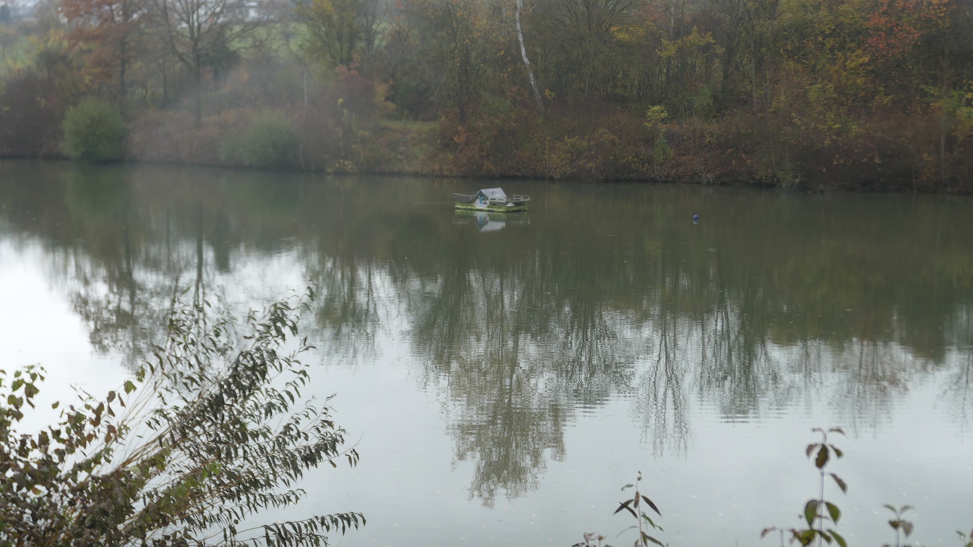 Amüsant anzusehen, über dem Wehr die Häuser vom Ort  mit der Kirche. Das Wasser braust, rauscht und in der  aufsteigenden hellen Gischt scheinen sich die Probleme jeden Einzelnen oder dieser Welt aufzulösen. Auf jedem Fall sind wir heute Nachmittag, freude, losgelöste Wanderer in der Natur. Wir überqueren  den Neckar und wandern auf einem Wiesenweg rechts flussaufwärts. Durch den leichten Sprühregen sind die Spiegelungen auf dem Wasser der gegenüber liegenden Bäume nicht so scharf. Den Tiefenlochsee sehen wir nur von weitem da er im Trinkwasserschutzgebiet liegt. Die Kirche von Neckartalfingen liegt vor uns im Dunst. Wieder ein Wehr mit Fischtreppe, das Rauschen lässt uns inne halten. Plötzlich sind wir am Rand von Neckartalfingen. Über einen Wiesenweg kommen wir zum Lutzsee.