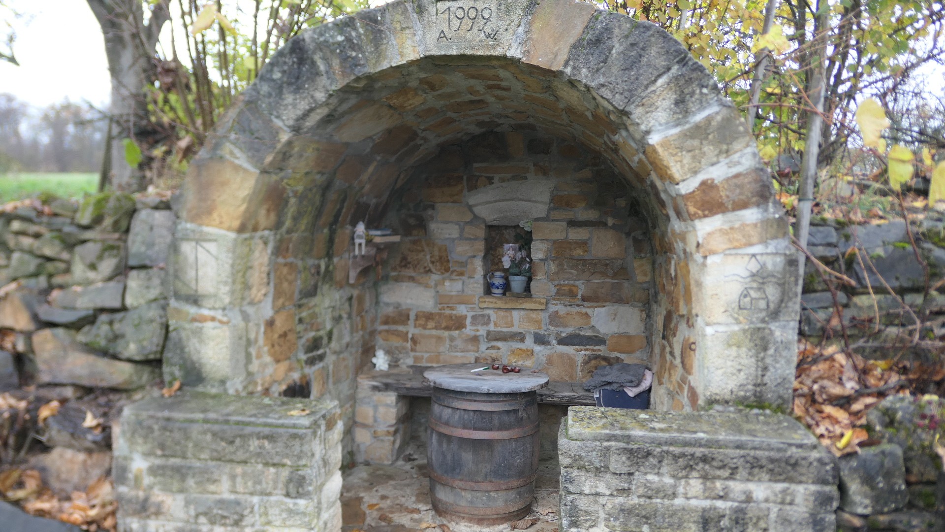 Über Streuobstwiesen geht es mal quer oder auch gerade nach oben. Am steinernen Wengerter Häusle machen wir Pause.
