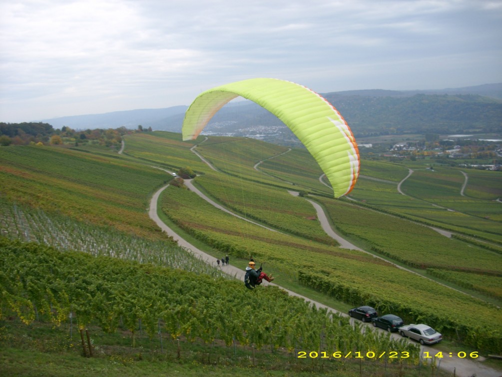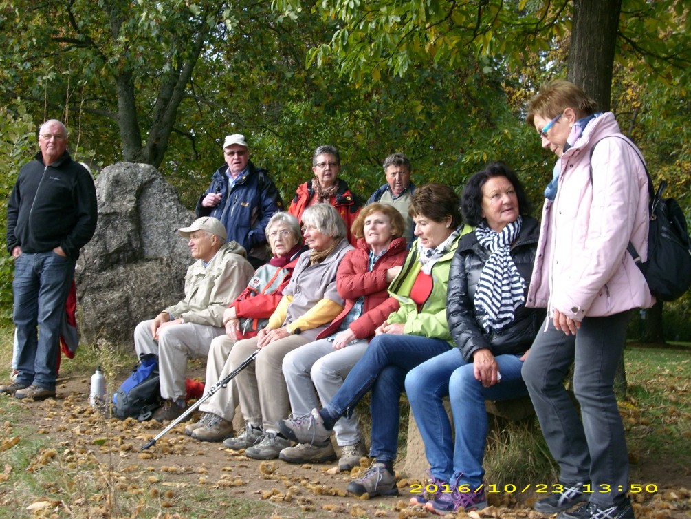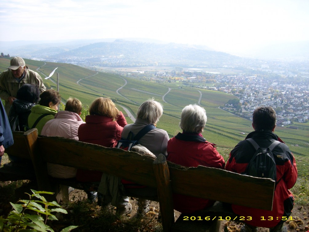 Schön ist der Blick über das Remstal zum Schurwald, die Schwäbische Alb ist leider nicht zusehen. Jetzt tauchen wir ein in den Laubwald, die herbstlichen Farben begeistern uns. Leicht ist der letzte Anstieg zum Kleinheppacher Kopf 440m.ü.M. Uns wurde eine grandiose Aussicht beschert. Hier ist gut sein. Maronen und Walnüsse gibt es genug. Beobachten von Drachenfliegern machen den Aufenthalt kurzweilig.