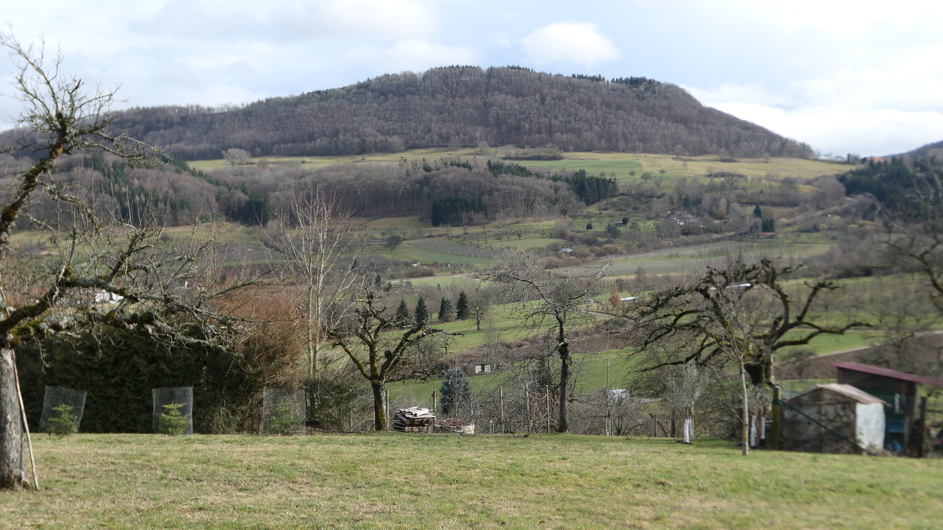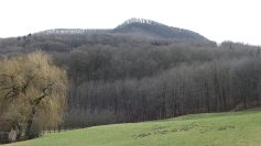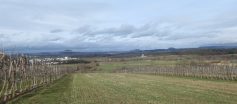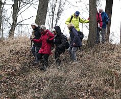 So geht es mit sicherem Schritt die Balance haltend, steil nach unten, doch im Burggraben unten angekommen, gehts wieder alle Kräfte mobilisierend nach oben. Diese gymnastische Einlage sorgte ein bisschen für Heiterkeit. Oben angekommen wird dieser Schreck etwas schmunzelnd mit Käsfüß und Nägelesbirnen Schnaps belohnt. Das gleiche Ritual wiederholt sich in umgekehrter Reihenfolge. Nachdem wir den Zillenhartwald hinter uns gelassen haben, kommen wir durch ein Streuobstwiesengebiet zum Gewand Wespenlauch. Dabei haben wir eine fantastische, gestochene scharfe Aussicht, vom Hohenstein über den Messelberg bis zu den Drei Kaiserbergen.