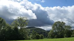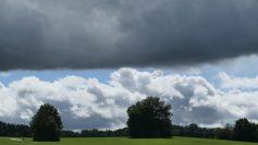 Unbeschreiblich die Schattierung vom tiefsten Schwarz zum hellsten Grau. Es ist schon etwas Rätselhaft, so sollen die Wolken wirklich Interessanter sein, als die Landschaft. Der Wanderführer erzählte vom Holzbrockeler, wie er von der Bevölkerung genannt wurde. Sein richtiger Name war Hauptmann von Roth, Besitzer vom Winzinger Schloß, ein gewalttätiger und gefühlloser Mann. Er ging nach seinem Tod als Geist umher. Sein Leben trug zur Entstehung der Sage, durch den Tannweiler Bauern Reiterle und der Reitererles Kapelle bei. Unser nächster Punkt ist der kahle nur mit Büschen bewachsener Schönberg. Er beschert uns eine wunderbare Rundumsicht, mit dem Trauf der Schwäbischen Alb. Die Wiesen leuchten in einem wunderbaren Grün als wären wir im Frühling. Nun geht es auf der Ostseite, gerade, oft auch steil nach oben, zum Gipfel des Stuifen mit 757 m. Der höchste Punkt liegt im Wald. An einem Holzkreuz zwischen den Bäumen geht es leicht abwärts zum Aussichtspunkt mit großem Kreuz. Es soll mal ein Steinbruch gewesen sein, darum der breite Weg nach unten. Nun geht es nur noch abwärts unserm Ausgangspunkt entgegen. Es ist noch festzustellen, es hat den ganzen Tag bei der Wanderung keinen Tropfen geregnet, beim Erreichen des Ziels beim Auto, fing es an zu regnen, das ist die perfekte Planung. Hinter uns liegt ein schöner erlebnisreicher Tag. Im Gasthaus und Cafe wurde jeder kulinarischer Wunsch erfüllt.